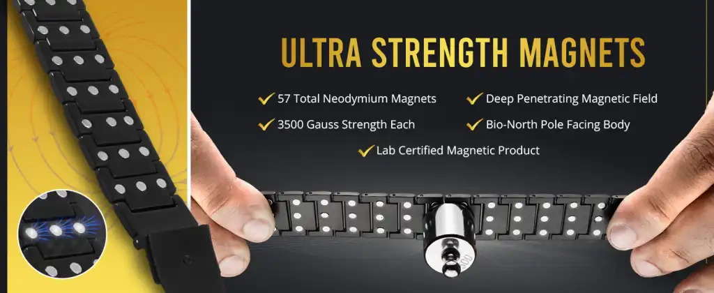 Vestavěné silné terapeutické magnety trojnásobné síly jsou strategicky rozmístěny po celé délce náramku, aby zajistily maximální účinnost a rovnoměrnou magnetickou energii.
